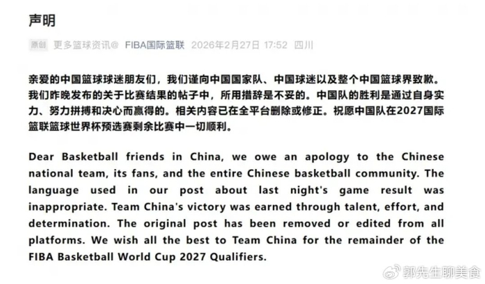 事情闹大后,FIBA的操作更让人无语。先连夜删帖改文案,把争议话换成“下半场翻盘”,假装什么都没发生;眼看中国球迷不买账,全球舆论都在骂,才慢吞吞发了个百字声明,不痛不痒说“措辞不妥”,承认胜利是靠实力拼来的。早干嘛去了?如果不是骂声太多,他们会觉得自己错了吗?这份道歉,更像被逼出来的公关话术,没有反思偏见,没有追责责任人,连句诚恳的检讨都没有,纯粹是为了平息风波的遮羞布。