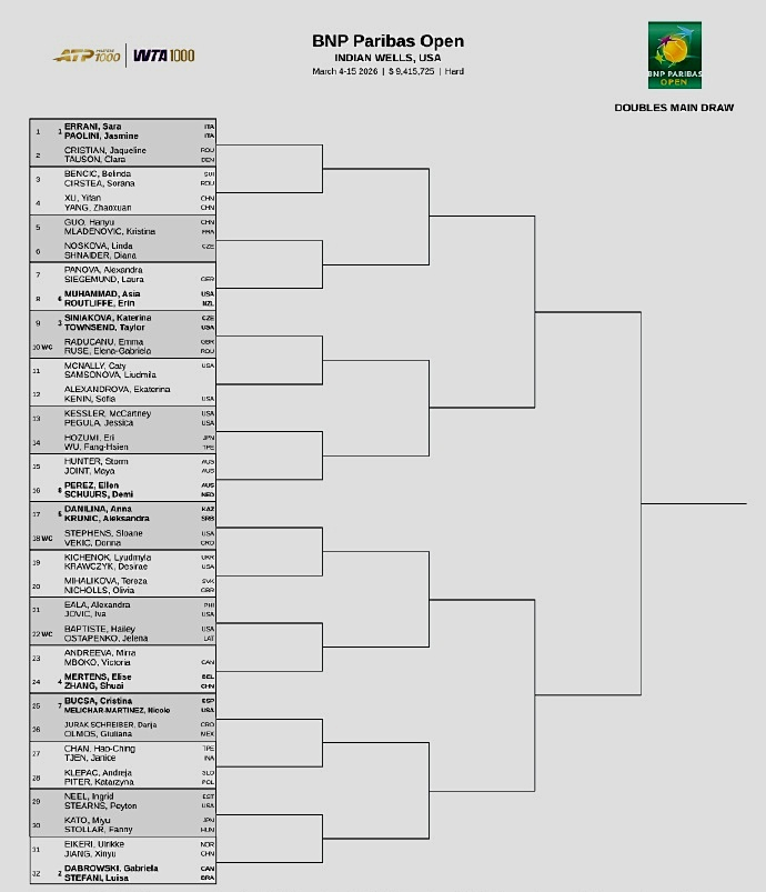 另外,在昨天公布的WTA1000印第安维尔斯站双打签表中,有五朵中国金花出战。她们的首轮对阵如下:张帅/梅尔滕斯 vs 安德列娃/姆博科、徐一璠/杨钊煊 vs 本西奇/科斯蒂亚、郭涵煜/穆拉德诺维奇 vs 诺斯科娃/施耐德、蒋欣玗/艾克里 vs 达布劳斯基/史蒂芬妮。