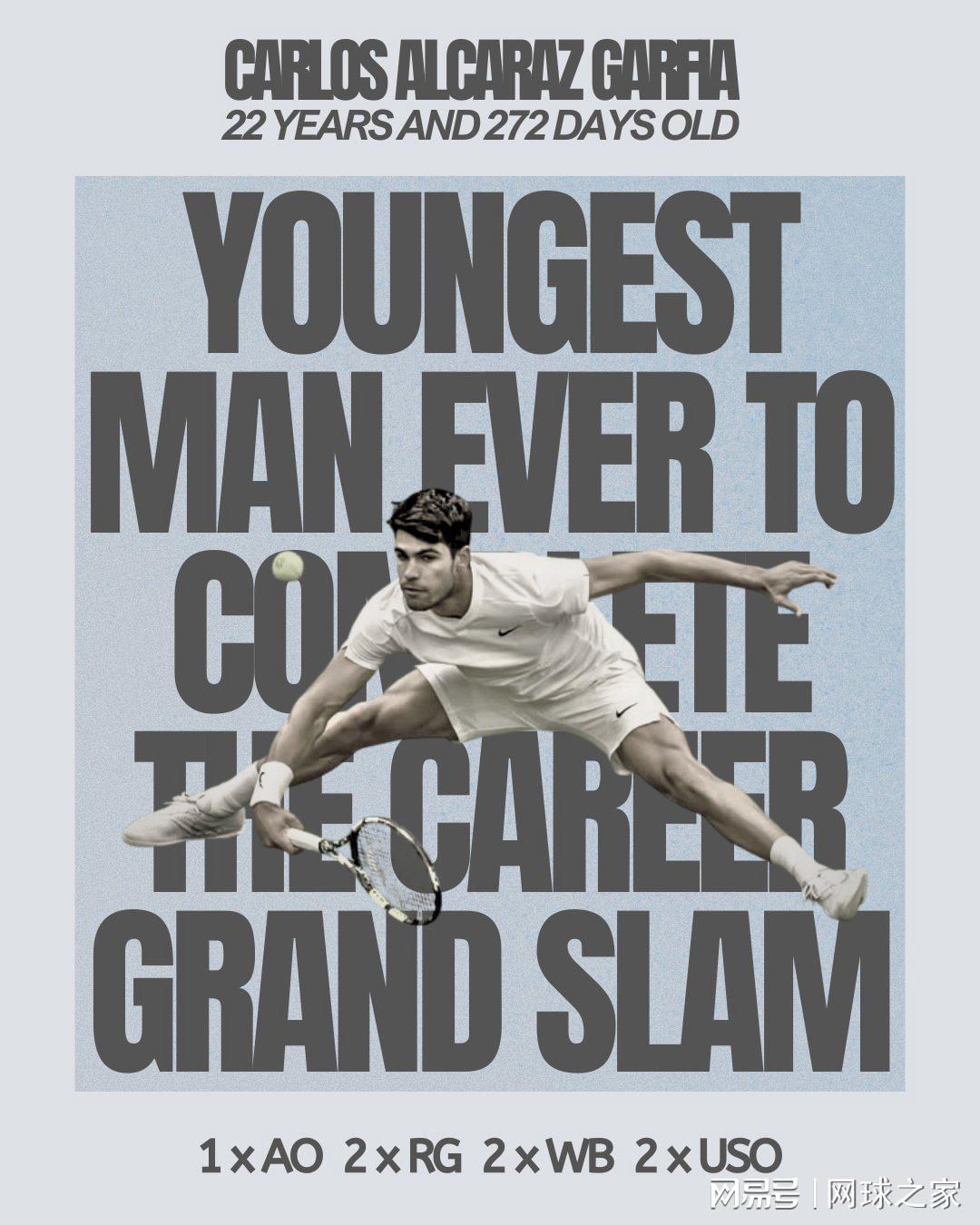 这一刻,阿尔卡拉斯不仅夺得了职业生涯第七座大满贯冠军奖杯,更实现了全满贯的伟业。他以22岁272天的年纪,打破了美国传奇唐·巴奇保持了87年的纪录(22岁363天),成为网球历史上最年轻的全满贯得主。